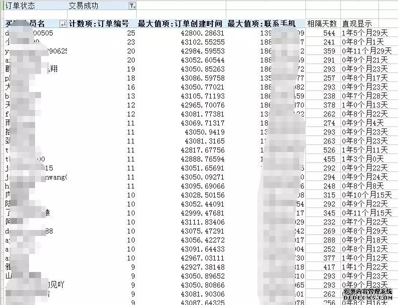 第二步:訂單導(dǎo)出之后,插入數(shù)據(jù)透視表,分別把【買家會(huì)員名】放進(jìn)【行】,把【訂單編號(hào)】放進(jìn)【值】要以計(jì)數(shù)的方式顯示,再把【訂單創(chuàng)建時(shí)間】放進(jìn)【值】,最后再把【聯(lián)系手機(jī)】放進(jìn)【值】,這里有兩個(gè)要注意的點(diǎn),那就是訂單創(chuàng)建時(shí)間放進(jìn)去之后,字段應(yīng)該選擇最大值,聯(lián)系手機(jī)選擇最大或者最小值都行,但都不要選擇計(jì)數(shù)或者求和,因?yàn)槟菢映鰜淼耐耆莵y的數(shù)據(jù)。最后選擇【訂單編號(hào)】降序