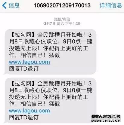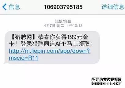 雖然用戶一般都知道獵聘是做招聘的,但你這個獵聘通道是干嘛的?金卡有什么用?用戶收到這條短信的第一感覺是:莫名其妙。還有就是鏈接太長了,短信中都是使用短鏈接。