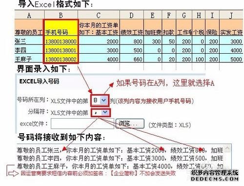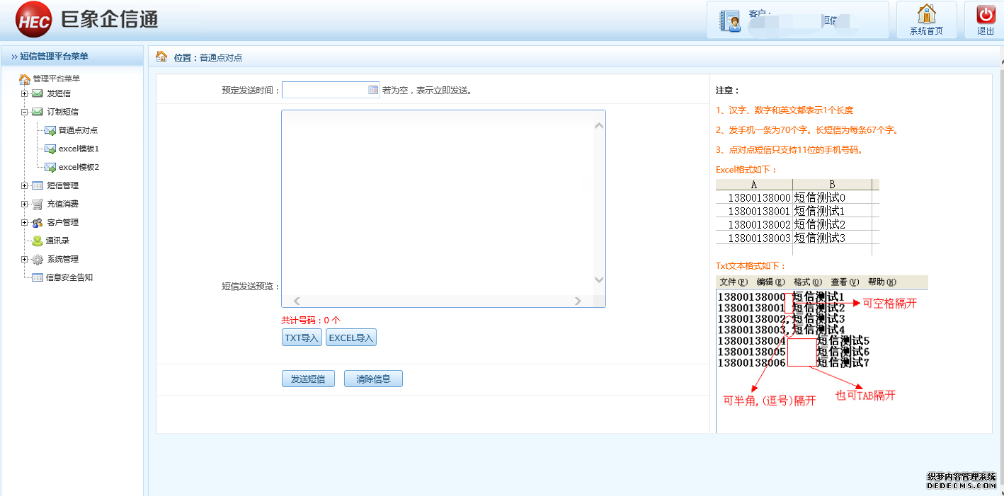 根據(jù)該頁面左邊的操作進(jìn)行發(fā)送短信,這里說的主要是是發(fā)送短信的時候格式的問題。選擇好導(dǎo)入發(fā)送,TXT或者EXCEl導(dǎo)入方式,然后點(diǎn)擊發(fā)送短信即可,根據(jù)提示操作。
